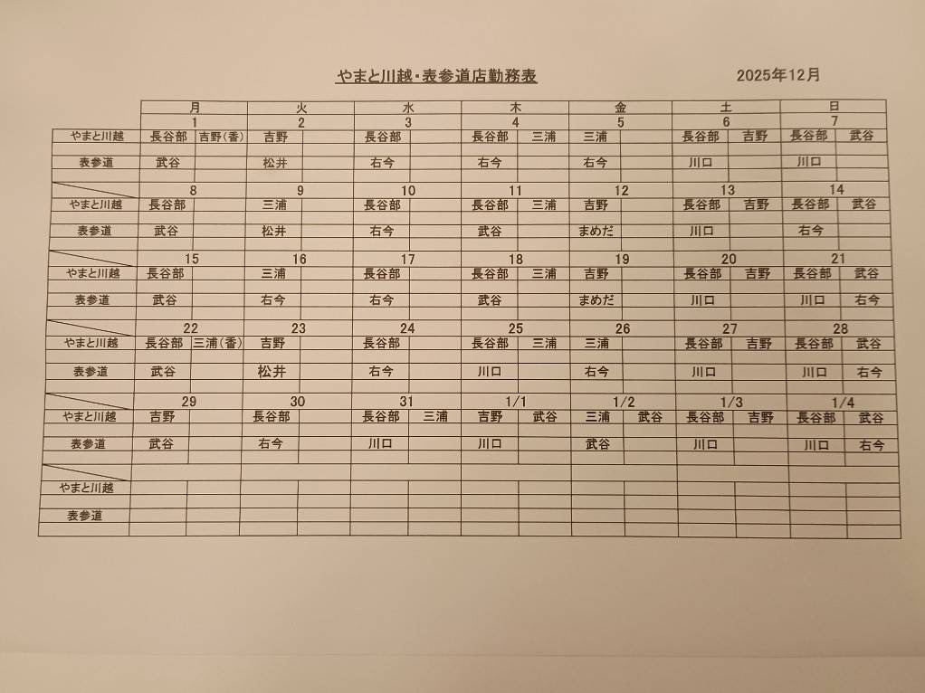 2025年12月 シフト(川越・表参道)