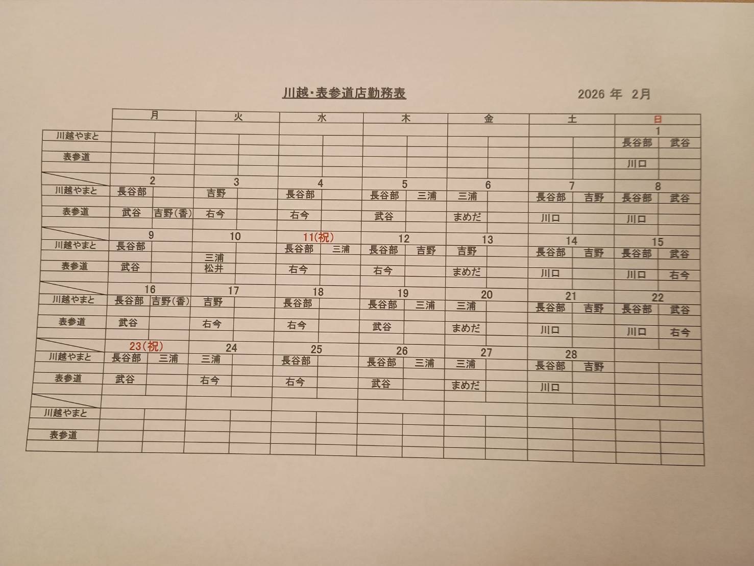 2026年2月 シフト(川越・表参道)