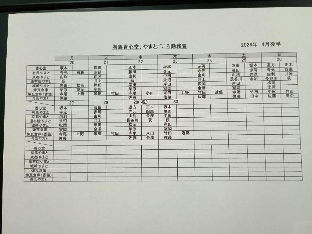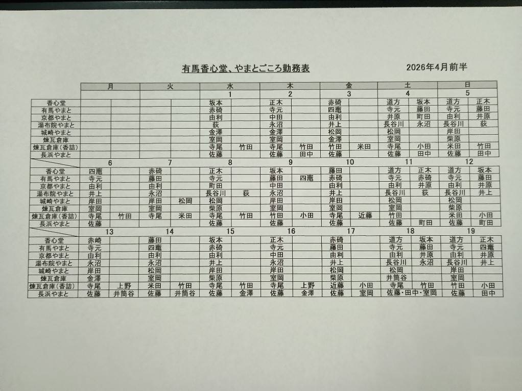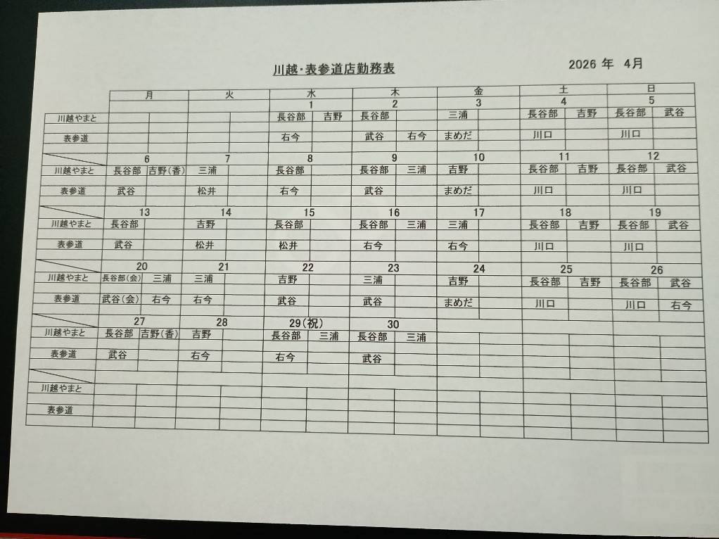 2026年4月 シフト(川越・表参道)